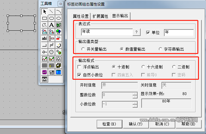 2.使用標簽在屬性設置輸入輸出連接勾線顯示輸出,后點擊顯示輸出表達式關聯PLC讀地址,單位輸入年,當然月就是輸入月,根據地址定義,輸出值類型選擇數值量輸出,輸出格式選擇十進制數,自然小數點,如下圖所示: