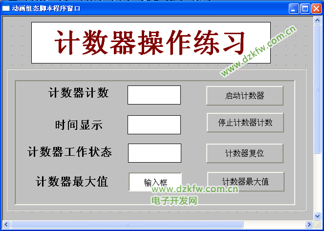 在MCGS組態軟件開發平臺上,單擊“用戶窗口”,再雙擊“腳本程序”窗 口,進入“動畫組態”,從“工具箱”中選中5次“標簽”,按效果圖放置,分別為 1號計數器操作演示,1號計數器計數,1號計數器時間顯示,1號計數器工作狀態,1號計數器最大值。再從“工具箱”中選中3次“標簽”,按效果圖放置,作為“1號計數器計數”、“時間顯示”、“1號計數器工作狀態顯 示”在運行時對應顯示用,從工具箱”中選中“輸入框”,針對“1號計數器最大值”運行時進行輸入。所用到的數據變暈 計數器1號、時間顯示、計數器1號工作狀態、計數器1號最大值在變暈的屬性設置中進行設置。計 時器的運行效果圖如圖12-1所示。