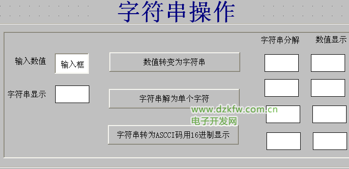 從“工具箱”中選中3次“標準按鈕”,分別拖放到桌面適當位置,按鈕名分別為 數值轉變為字符串、字符串分解為單個字符、字符轉為ASCII碼用16進制顯示。