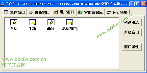 ·進入MCGS 組態軟件新建工程,在菜單“文件”中選擇“工程另存為”選項, 把新建工程存為: D:\MCGS\WORK\全自動洗衣機系統的監控系統設計。進入MCGS 組態平臺單擊“新建窗口”按鈕,分別創建4個新的用戶窗口以圖標形式顯示,分別命名為“自動主窗口”、“手動窗口”、“曲線窗口”、“啟動窗口”。用戶窗口如圖實訓1-4至圖實訓1-7所示。