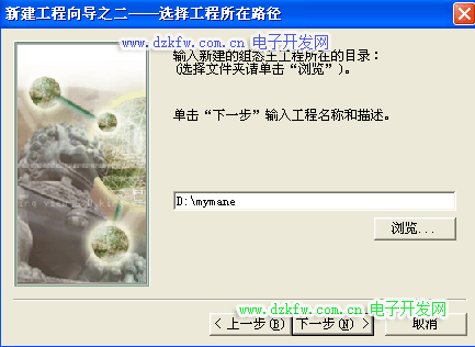 3、在工程路徑文本框中輸入一個有效的工程路徑,或單擊“瀏覽 ”按鈕,在彈出的路徑選擇對話框中選擇一個有效的路徑。單擊“下一步”繼續。彈出“新建工程向導之三對話框”,如下圖2.3所示。