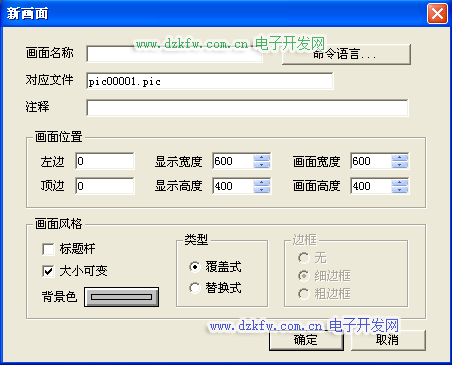 進入新建的組態王工程,選擇工程瀏覽器左側大綱項“文件\畫面”,在工程瀏覽器右側用鼠標左鍵雙擊“新建”圖標,彈出對話框如圖2.5 所示。