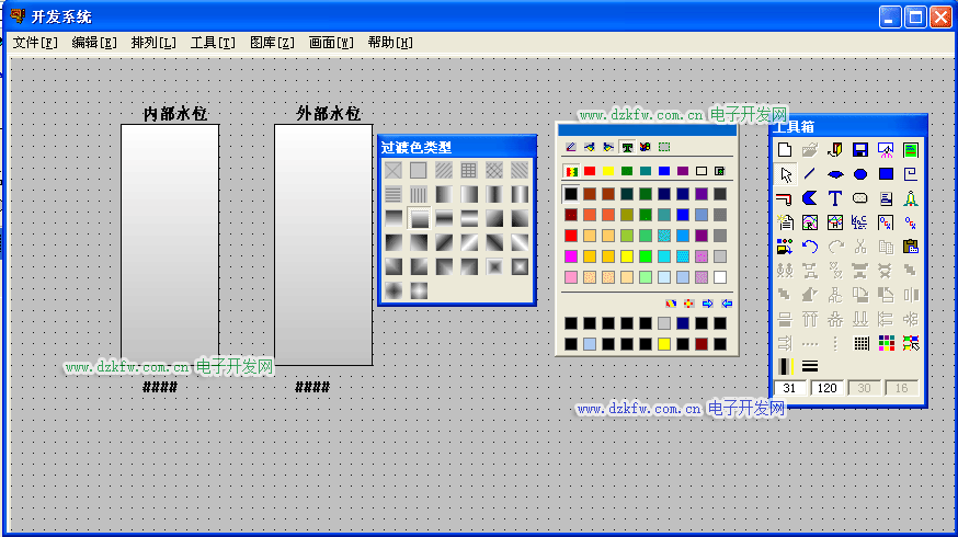 在工具箱中選中“文本”,此時鼠標變成“I”形狀,在畫面上單擊鼠標左鍵,在內部水位矩形圖下輸入“####”文字。在“調色板”窗口點擊第一行第四個“文本色”按鈕,從下面的色塊中選取黑色作為字符色。