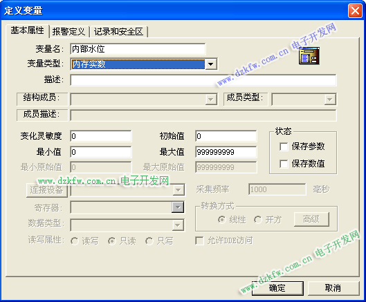 此對話框可以對數據變量完成定義、修改等操作,以及數據庫的管理工作。在“變量名”處輸入變量名,如:內部水位;在“變量類型”處選擇變量類型如:內存實數,其它屬性目前不用更改,單擊“確定”即可。