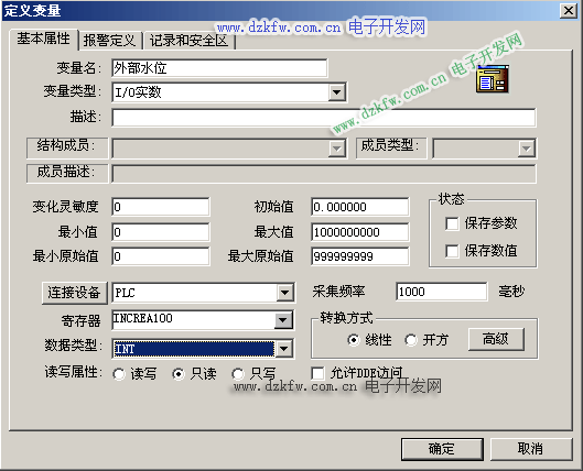 在“變量名”處輸入變量名,如:外部水位;在“變量類型”處選擇變量類型如:IO 整數;在“連接設備”中選擇先前定義好的IO 設備:PLC;在“寄存器”中定義為:INCREA100;在“數據類型”中定義為:INT 類型。其它屬性目前不用更改,單擊“確定”即可。