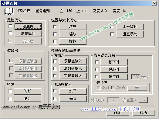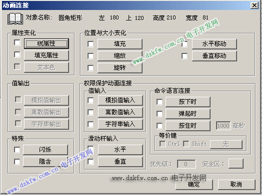 一個圖形對象可以同時定義多個連接,組合成復雜的效果,以便滿足實際中任意的動畫顯示需要。創建動畫連接