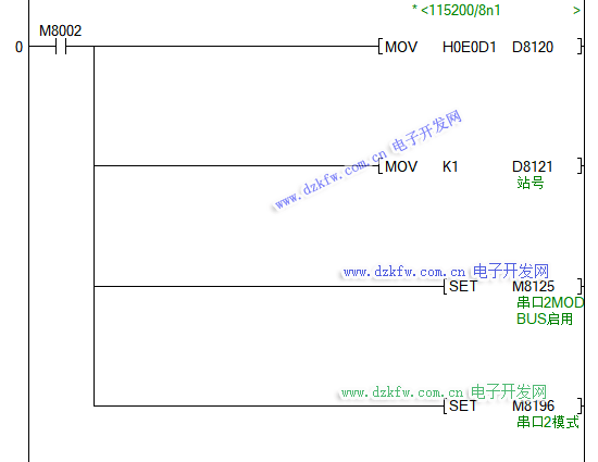 n PLC的串口參數配置寄存器(D8120),通過圖2的配置表將串口設定為H0E0D1(115200-無校驗-1個停止位-8個數據位-RTU模式),B13-b15默認都配置為1。