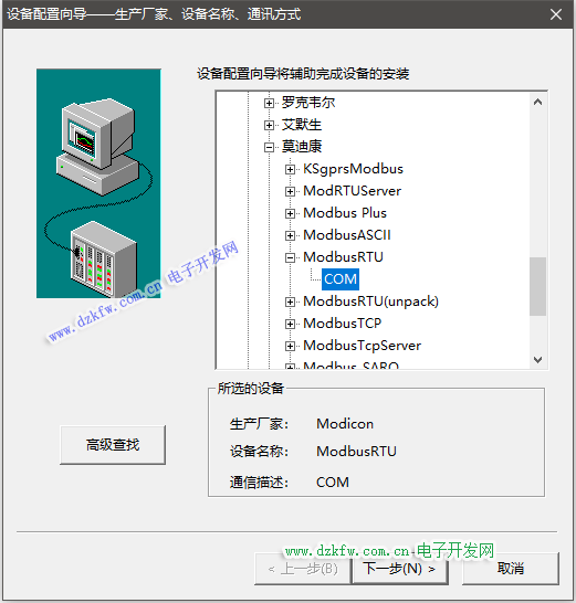 點擊下一步后選擇對應的端口號,在上一節中我將PLC的MODBUS地址設為1,組態王的通信設備地址也設置為1,否則將無法正常通信。