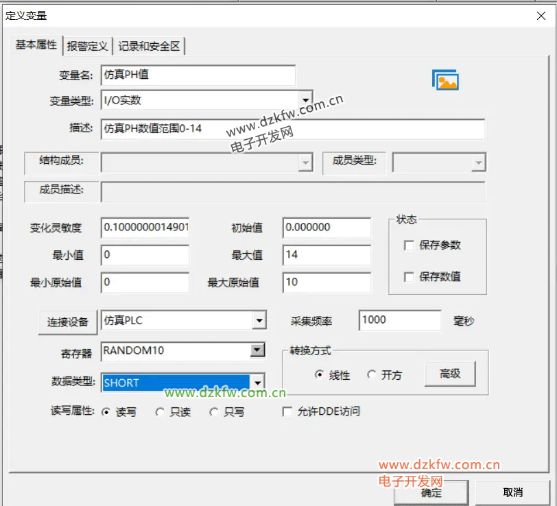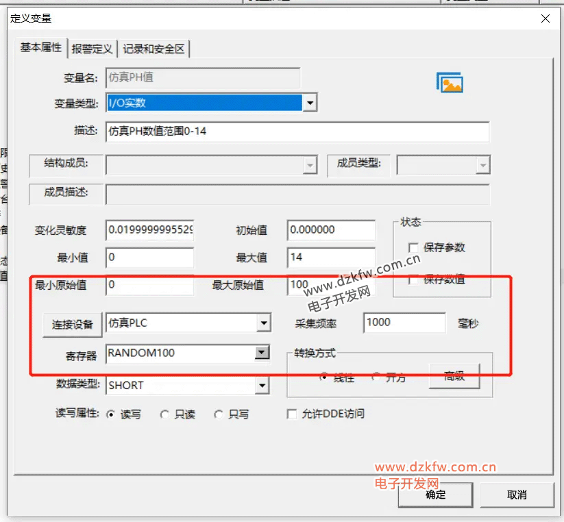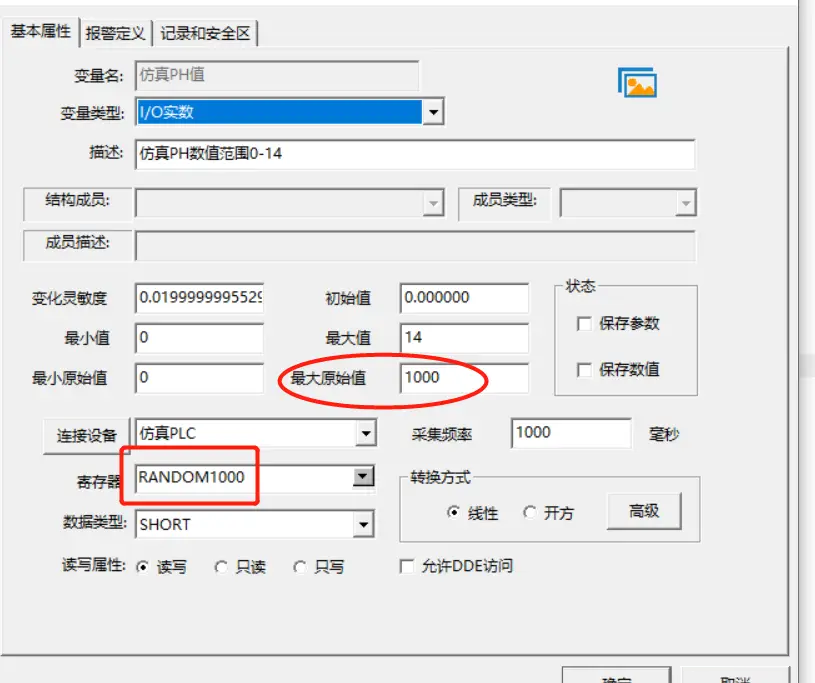 變量類型:I/O實數;變化靈敏度:0.1;初始值為0.0;最小值為0,最大值為14;寄存器選擇隨機函數RANDOM10 (表示隨機值的范圍是0-10);這個是最小原始值到最大原始值。