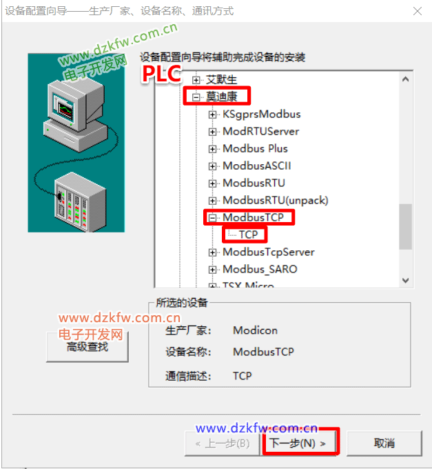 5、選擇PLC->莫迪康->ModbusTCP->TCP