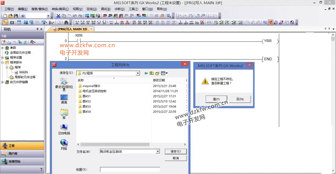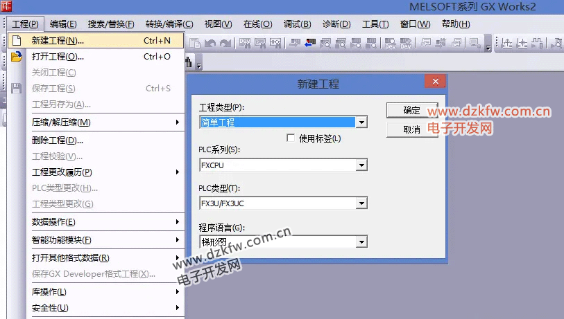 新建工程,在我們菜單欄里面最左邊有一個工程按鈕,我們把這個工程按鈕點(diǎn)開,點(diǎn)開之后,第一項有一個新建工程,我們點(diǎn)開新建工程,就會彈出來一個對話框新建工程。首先我們選工程類型選擇簡單工程,使用標(biāo)簽不做選擇,PLC系列我們選FXCPU , PLC類型我們選FX3U FX3UC ,程序語言我們選梯形圖 ,選完之后我們在這里點(diǎn)確認(rèn)就可以了,然后確認(rèn)之后我們就可以在這個編輯區(qū)編寫程序。