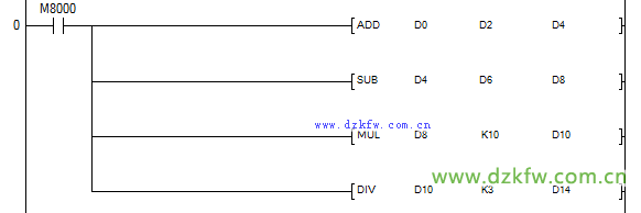 6、FX5U編程指令的修改:比如指令中對ADD/SUB/MUL/DIV的四則運算指令進行了簡化設計,用戶可以通過四則運算符號進行直接輸入。