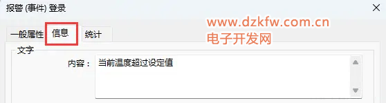 然后需要在事件登錄中添加M0作為報警信息,顯示信息設置為“當前溫度超過設定值”