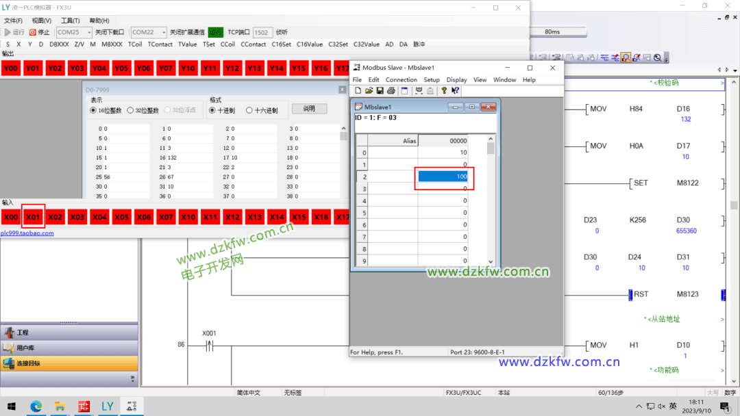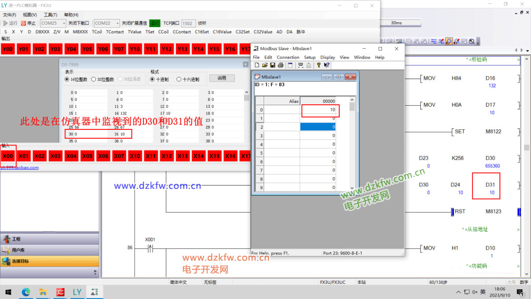 單擊仿真器中的X0按鈕,觀察D31的值是否與Modbus Slave中保持寄存器40000設置的值一致。