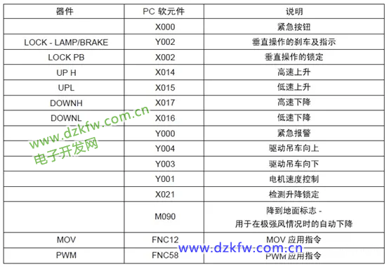 本程序語序吊車在正常時以兩種不同速度升高或降低,如果風速超過一定限值,吊車會被限制在低速運行,如果風力過強,吊車會自動以“爬行“速度降到地面。用以表示風速變化的標志是:M32,M36,和M37。