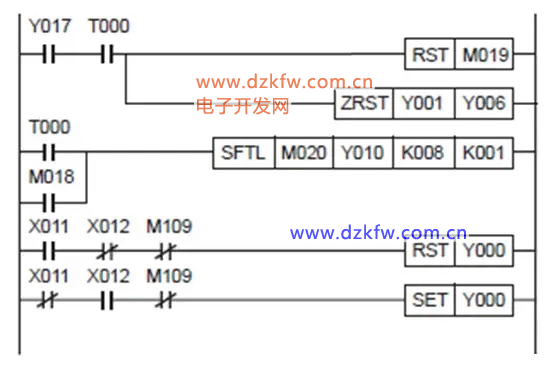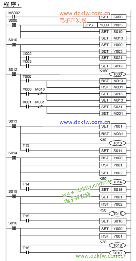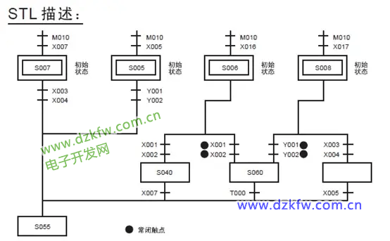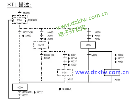 可以注意到本程序是以梯形圖或STL形式編寫的,這對于下面要講的兩點來說時非常重要的。如果研究STL步S20和S30的內容,可看到它們都包含Y3輸出,在標準編程技術中,這叫做雙線圈輸出,是絕對不允許的。在正常編程中,如果一次出現的輸出Y3接通,而在同一次掃描中第二次出現時復位此輸出,從而導致一種很危險的情況。不過,因為STL編程每一個STL步的程序相對獨立,輸出線圈在許多STL塊中的使用是很安全的,從而使編程更簡單。
