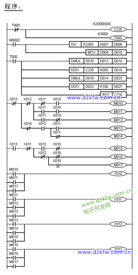 由風驅動的旋軸直徑必須輸入到數據寄存器D12中,它應以mm為單位輸入,即0.1m=100mm:輸入100至D12.旋軸的旋轉次數由高速計數器C235來計數,數據輸入由X000輸入。