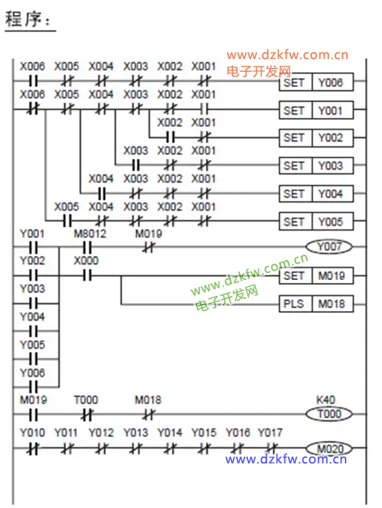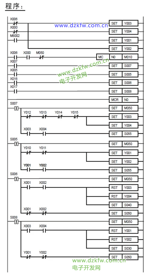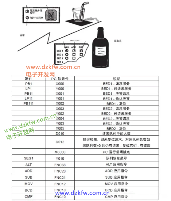 本例可以成為遠程顧客和服務員間的信息傳送系統,PC卓偉調度和傳送器。遠程顧客要求某種服務,通過一個輸入(如:X000)給服務員發信號,這個輸入驅動一個信號燈,燈高速顧客和服務員已經發出一個請求。服務員知道請求來于哪里,因為用以接通信號燈的輸出對應于一個位置(如:Y000)。當服務員注意到這個請求,一個應答信號送回至顧客(如X001,Y001),顧客就能確信服務員已收到請求,服務員也會知道哪位顧客正在請求。當服務員滿足了顧客要求時,復位應答信號(如X002)。此過程可為下一個顧客所重復(如:X003-005,Y002-003)。所以,當前等待顧客能知道輪到他們得花多少時間,一個7段顯示表示現在排隊得顧客數。本例只列出兩個呼叫臺,當然還可以增加。
