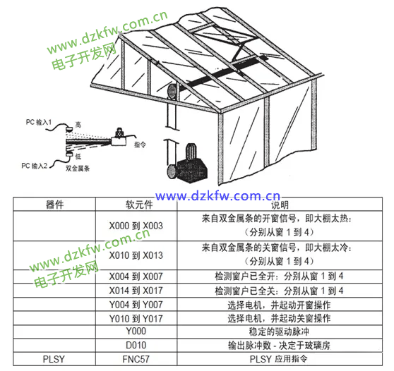 編程者經常違背得規則中有一條是”簡單化原則“。如果程序簡單,則是容易寫出,容易檢查,而且是很少會出錯。不是所有情況都要求7位精度或好的控制,本頁給出的大棚說明了一個在學校中學到的基本原理是如何用來有效而廉價地解決問題地。本例中,雙金屬條用來檢測周圍溫度,這可以是一個控制所有窗戶地大型商業綠棚,或是有一個窗戶的花園綠棚。本例是控制四扇窗戶,每扇窗戶有一個檢測溫度的雙金屬條,對每個雙金屬條,存在兩個輸入,一個對應金屬條冷的情況,這可以認為是常閉的,另一個對應金屬條熱的情況(即它變形時),可認為時一個常開接點。這些輸入與窗戶狀態有直接聯系,如果過熱,雙金屬條彎曲,觸點接通,于是窗戶打開。當大棚部分變冷時,雙金屬條伸直,窗戶關上。
