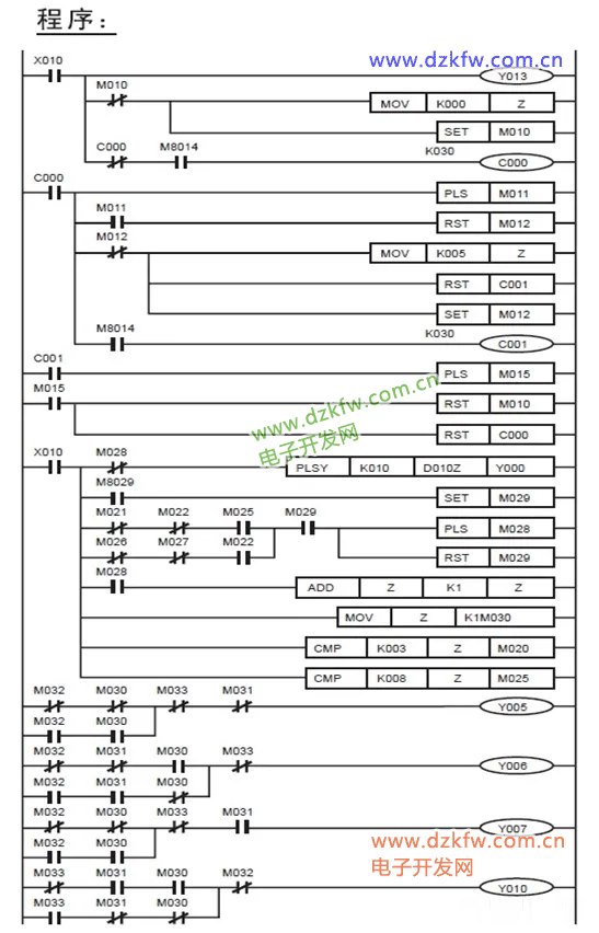 因為數據寄存器通過變址寄存器Z得遞增來選擇,這種方法也用于獨立地選擇每個閥門。是這么實現的:移動Z中的數據進入位模式,接著有效位元件用來驅動所選擇的閥門,也可使用多路比較指令來完成。通過接通閥門選擇輸出Y5到Y10中的一個,PLSY指令(Y000)的單脈沖輸出一次重定向至每個閥門。