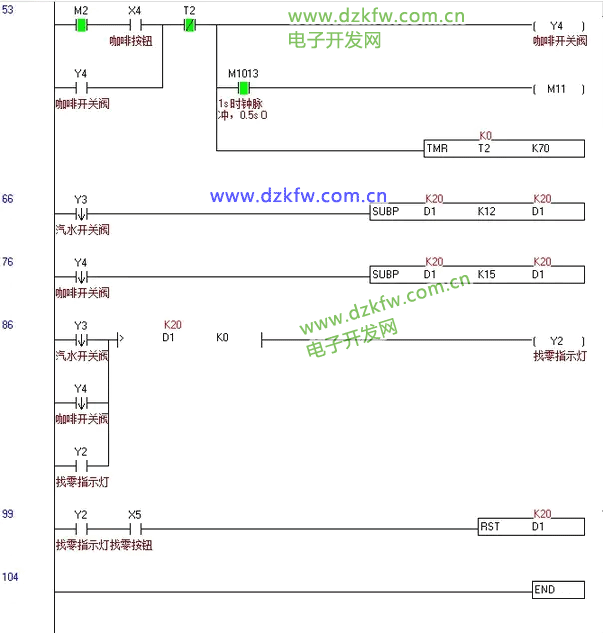 - 若對應價格飲料排出后總額還有多余的金額,則找零指示燈Y002會亮起,按下找零按鈕X005則自動退回多余的金額后找零指示燈Y002熄滅。