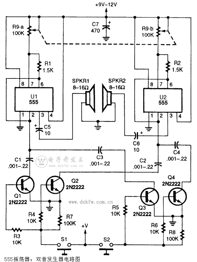 555 oscillator: dual tone generator circuit 555振蕩器:雙音發(fā)生器電路圖