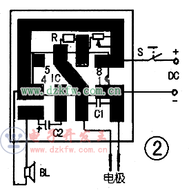 筆者介紹一款由時(shí)基集成電路NE555及幾只外圍元件組成的另一款更簡(jiǎn)易的冷凝塔液位告知裝置的制作.電路如圖1所示.圖2為印制板及接線圖。 圖1是一個(gè)無穩(wěn)態(tài)振蕩電路.其兩電極浸在處于正常液位的水中,彼此相當(dāng)于連通,電容C1被短接而不能充電。因此電路停振。小型揚(yáng)聲器BL不發(fā)聲。一旦出現(xiàn)異常情況(缺水)時(shí),兩電極便不再與水接觸而呈開路狀態(tài),C1充電,電路開始振蕩.BL發(fā)出響聲通過操作人員。調(diào)節(jié)可調(diào)電NRP的阻值。可改變BL響聲的頻率。電極的制作和安裝參照原文(即“冷凝塔簡(jiǎn)易液位告知裝置”)的內(nèi)容便可。