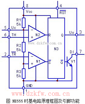 如上圖所示,R1、R2、R3對供電Vcc分壓,使N1比較器基準端(同相輸入端)電壓為1/3Vcc,N2基準端(反相輸入端)電壓為2/3Vcc。芯片5腳為調整端,接入上拉或下拉電阻時,可改變兩個基準端電壓的高低。兩路比較器的輸出端與R-S觸發器的置位和復位相接,從而決定芯片3腳輸出端的電平狀態。當芯片2腳(/TR端)輸入信號電壓低于1/3Vcc時,N1輸出端為“0”,R-S觸發器被置位,芯片3腳變高電平,(在復位信號未輸入之前)并保持;當芯片6腳輸入電壓高于2/3Vcc時,N2輸出端為“1”,R-S觸發器被復位(在置位信號未輸入之前)并保持。芯片4為優先復位端(低電平有效),不用時可接Vcc。