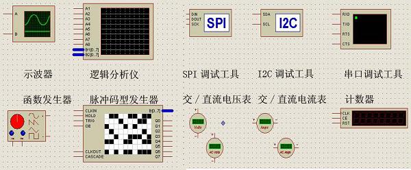 Proteus 的虛擬工具箱提供了電路測試中的常用工具和儀器,主要用于在實時仿真同時的電路參數(shù)觀測,測量結(jié)果隨仿真動態(tài)變化并顯示,可以滿足精度要求不是很高的測量分析,對于電路特性的定性分析可以起到事半功倍的效果,大大節(jié)約了測試時間和開發(fā)成本。軟件提供的虛擬工具和儀器如圖1.1 所示。