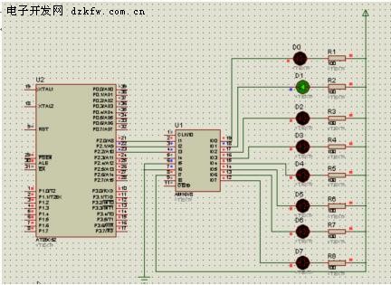 為了觀察16V8的輸入與輸出的對應關系,我們在AT89C52的程序(程序見附錄)中將與I3、I2、I1相連的P2_2、P2_1、P2_0三個端口按真值表中的順序依次改變,觀察LED燈是否由IO0至IO7依附點亮。
