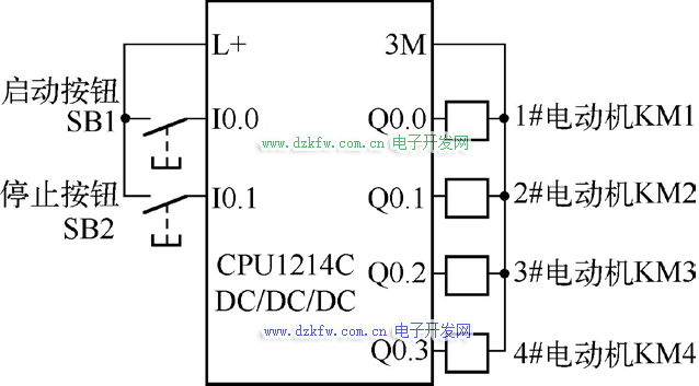 1.PLC 控制任務說明 用按鈕控制四臺電動機:按下啟動按鈕,先啟動第一臺電動機后,每隔 5s 啟動一臺電動機,直至第四臺電動機啟動完畢;按下停止按鈕,四臺電動機同時停止運轉。