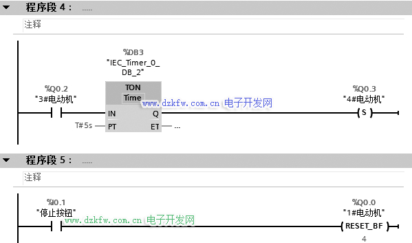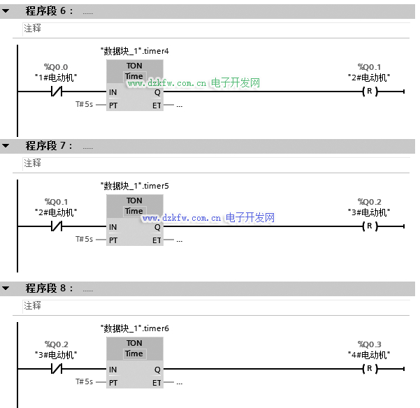 四臺電動機順序定時啟動、順序定時停止的 PLC 梯形圖如圖 3-16 所示,與【實例 14 】相比,程序 段1 ~程序段 4 相同,區別在于停止方式,即在全局 DB 塊中定義三個順序定時啟動定時器和三個順序停 止定時定時器,分別為“ 數據塊 _1”.timer1 到 “ 數據塊 _1”.timer6 。程序段 5 ~程序段 8 為順序停止過程。