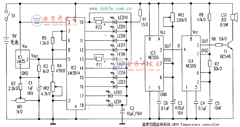 監測系統采用10只LED.每只LED代表一個溫度步階(1℃),10只LED組成一只溫度顯示條.顯示條中的最后一只LED(LED10)用來指示溫度已達到最高允許溫度。另外,電路還采用兩只蜂鳴器:一只用來在溫度達到50%的溫度容限時發出警報;另一只用來在LED10發光時發出報警信號。
