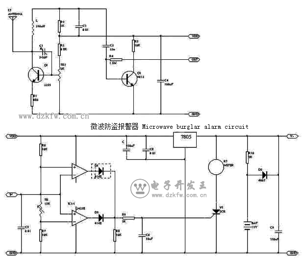 微波是指頻率 f>300MHz的無線電波。根據微波多普勒效應原理(也就是雷達基本原理)制作成的防盜報警器,我們就叫它微波防盜報警器或者雷達式防盜報警器。這種微波防盜報警器無方向性及死區,可對360度的一個圓區域進行探測,很適合在機關、倉庫、銀行、商店、果園、魚塘、家庭等需要保安防盜的場所安裝使用。只要作案分子進人警戒范圍(半徑<=8m的圓區域),它便反復發出響亮的“抓賊呀一”喊聲來,使盜賊聞聲喪膽。為防止犯罪分子破壞報警器,它還具有斷線報警和交直流電源自動轉換供電功能。