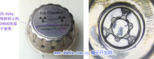 去掉離子型煙霧傳感器外殼,可以看到內部包含有 Am-241 的放射源金屬片。將該金屬片放在蓋革管旁邊,可以引起蓋革管放電脈沖劇增。