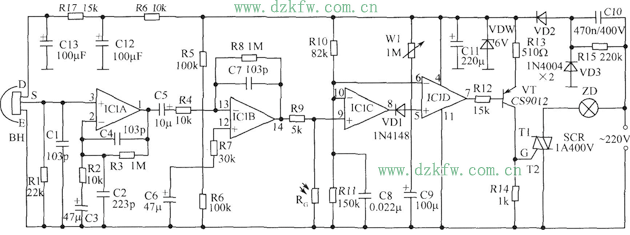 如圖所示為水塔水位控制器電路。圖中,IC2可用各種555時基集成電路。IC3為紅外接收解碼集成電路 CX20106A。IC4可用4N25、4N26、PC817等光電耦合器。紅外接收部分亦可購買成品紅外接收組件或一體化紅外接收頭,可方便制作,提高可靠性。VD1、VD2和VD3選用電視遙控器用紅外發射、接收二極管。J選用國產新型記憶自鎖繼電器,該產品外形與普通繼電器相同,不同之處在于吸合后不需維持電流,僅在吸合和釋放時需一定脈沖驅動功率,然后由機械結構保持“鎖定”。主要參數:額定電壓12V,觸發脈寬>20ms矩形驅動脈沖,瞬態功耗<0.9W,壽命為10萬次。觸點電流有3A、30A等,可根據需要選用。對于三相水泵電機,可通過該繼電器控制交流接觸器。其余元件如圖所注。