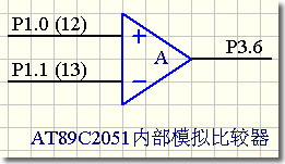 不知大家有沒有發(fā)現(xiàn): 標(biāo)準(zhǔn)51單片機有32根可編程I/O口線,89C2051精簡掉P0、P2口16根I/O線后,應(yīng)該還有16根I/O口線,現(xiàn)在只有15根,另一根跑那里去了呢?!前面講到AT89C2051內(nèi)部集成了一個模擬比較器,正是因為集成了模擬比較器把另一根引線占用了,比較器的輸出端占用了一個I/O口,它就是P3.6口,引腳P3.6沒有接出來的,所以少一根I/O口線。在編程時,P3.6就只能用來讀比較器的狀態(tài)了,不能象其它I/O口一樣用來驅(qū)動外部指示燈等設(shè)備了,不過模擬比較器很實用的,在開發(fā)中就可以省去外加比較器的麻煩,右圖為比較器的原理。 |