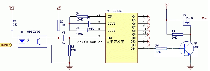 如上圖:電路工作的時候只要定時給CD4060復位脈沖,就能保證Q1處于截至狀態,從而使受控的NMOS管處于導通狀態給處理器電路系統供電。