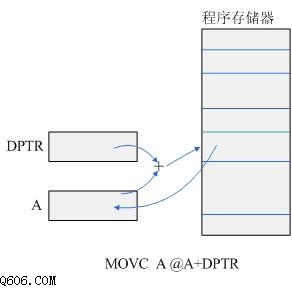 由寄存器DPTR或PC中的內容加上A累加器內容之和而形成操作數地址的尋址方式稱為變址尋址。變址尋址只能對程序存儲器中的數據進行尋址操作。由于程序存儲器是只讀存貯器,因此變址尋址只有讀操作而無寫操作。在指令符號上采用MOVC的形式。
