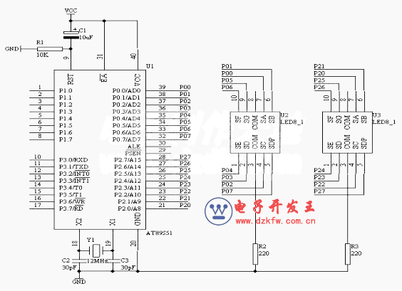 如下圖所示,在AT89S51單片機的P0和P2端口分別接有兩個共陰數碼管,P0口驅動顯示秒時間的十位,而P2口驅動顯示秒時間的個位。