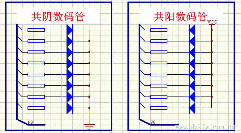 從我們板子的電路圖上能看出來(lái),我們所用的數(shù)碼管是共陽(yáng)數(shù)碼管,如圖所示。