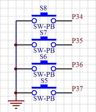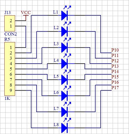 下面我寫一個簡單的程序,功能為:當一個鍵按下時,讓一個發光二極管發光,我們先看下按鍵模塊在實驗板上的原理圖,如圖7和圖8所示。