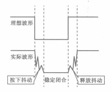 由于機械觸點的彈性作用,一個按鍵開關在閉合時不會馬上穩定地接通,在斷開時也不會一下子斷開。因而在閉合及斷開的瞬間均伴隨有一連串的抖動,與單片機I/O口相接的一端的電壓會出現相應的變化,如圖6所示。