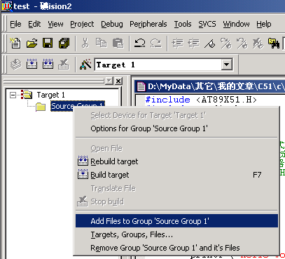 這段程序的功能是不斷從串口輸出"Hello World!"字符,我們先不管程序的語法和意思吧,先看看如何把它加入到項目中和如何編譯試運行。 (4)點擊圖1-5中的3保存新建的程序,也可以用菜單File-Save或快捷鍵Ctrl+S進行保存。因是新文件所以保存時會彈出類似圖1-3的文件操作窗口,我們把第一個程序命名為test1.c,保存在項目所在的目錄中,這時你會發現程序單詞有了不同的顏色,說明KEIL的C語法檢查生效了。如圖1-6鼠標在屏幕左邊的Source Group1文件夾圖標上右擊彈出菜單,在這里可以做在項目中增加減少文件等操作。我們?quot;Add File to Group 'Source Group 1'"彈出文件窗口,選擇剛剛保存的文件,按ADD按鈕,關閉文件窗,程序文件已加到項目中了。這時在Source Group1文件夾圖標左邊出現了一個小+號說明,文件組中有了文件,點擊它可以展開查看。