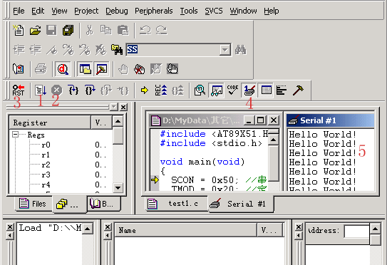 (6)進入調試模式,軟件窗口樣式大致如圖1-8所示。圖中1為運行,當程序處于停止狀態時才有效,2為停止,程序處于運行狀態時才有效。3是復位,模擬芯片的復位,程序回到最開頭處執行。按4我們可以打開5中的串行調試窗口,這個窗口我們可以看到從51芯片的串行口輸入輸出的字符,這里的第一個項目也正是在這里看運行結果。這些在菜單中也有,這里不再一一介紹大家不妨找找看,其它的功能也會在后面的課程中慢慢介紹。首先按4打開串行調試窗口,再按運行鍵,這時就可以看到串行調試窗口中不斷的打?quot;Hello World!"。呵呵,是不是不難呀?這樣就完成了您的第一個C項目。最后我們要停止程序運行回到文件編輯模式中,就要先按停止按鈕再按開啟\關閉調試模式按鈕。然后我們就可以進行關閉KEIL等相關操作了。 到此為止,第一課已經完結了,初步學習了一些KEIL uVision2的項目文件創建、編譯、運行和軟件仿真的基本操作方法。其中一直有提到一些功能的快捷鍵的使用,的確在實際的開發應用中快捷鍵的運用可以大大提高工作的效率,建議大家多多使用,還有就是對這里所講的操作方法舉一反三用于類似的操作中。