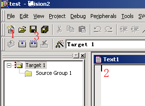 (3)首先我們要在項目中創建新的程序文件或加入舊程序文件。如果你沒有現成的程序,那么就要新建一個程序文件。在KEIL中有一些程序的Demo,在這里我們還是以一個C程序為例介紹如何新建一個C程序和如何加到您的第一個項目中吧。點擊圖1-5中1的新建文件的快捷按鈕,在2中出現一個新的文字編輯窗口,這個操作也可以通過菜單File-New或快捷鍵Ctrl+N來實現。好了,現在可以編寫程序了,光標已出現在文本編輯窗口中,等待我們的輸入了。第一程序嘛,寫個簡單明了的吧。下面是經典的一段程序,呵,如果你看過別的程序書也許也有類似的程序: