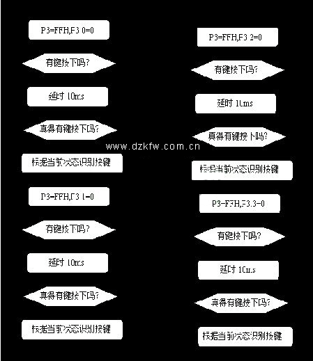 (2)每個按鍵都有它的行值和列值,行值和列值的組合就是識別這個按鍵的編碼。矩陣的行線和列線分別通過兩并行接口和CPU通信。鍵盤的一端(列線)通過電阻接VCC,而接地是通過程序輸出數字“0”實現的。鍵盤處理程序的任務是:確定有無鍵按下,判斷哪一個鍵按下,鍵的功能是什么?還要消除按鍵在閉合或斷開時的抖動。兩個并行口中,一個輸出掃描碼,使按鍵逐行動態接地;另一個并行口輸入按鍵狀態,由行掃描值和回饋信號共同形成鍵編碼而識別按鍵,通過軟件查表,查出該鍵的功能。