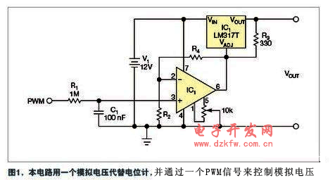 美國國家半導體公司的LM317T是一種常用的可調電壓穩壓器,能以最大1.5A電流提供1.25V~37V的輸出電壓。用一只電位計就可以調節輸出電壓。圖1中的電路用一個模擬電壓代替了電位計,模擬電壓可以由一個PWM(脈沖寬度調制)信號控制。通過一只微控制器或任何其它數字電路都可以控制此信號。同一個微控制器還能夠動態地監控和調節LM317T的輸出。下圖是一個可調穩壓電源