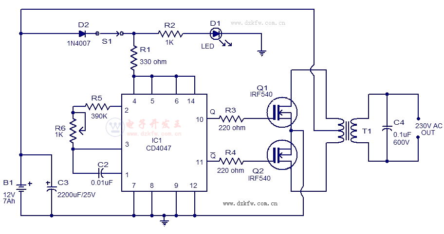 下面是一個簡單的100瓦的使用CD4047和IRF540 MOSFET的逆變器的電路圖。該電路簡單,成本低,甚至可以組裝一個veroboard.