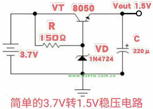 用簡單分立元件制作3.7V轉1.5V的穩壓電路,最簡單的電路只需一個三極管和一個穩壓管即可構成。下面介紹兩款簡單易制、不需調試的3.7V轉1.5V穩壓電路。
